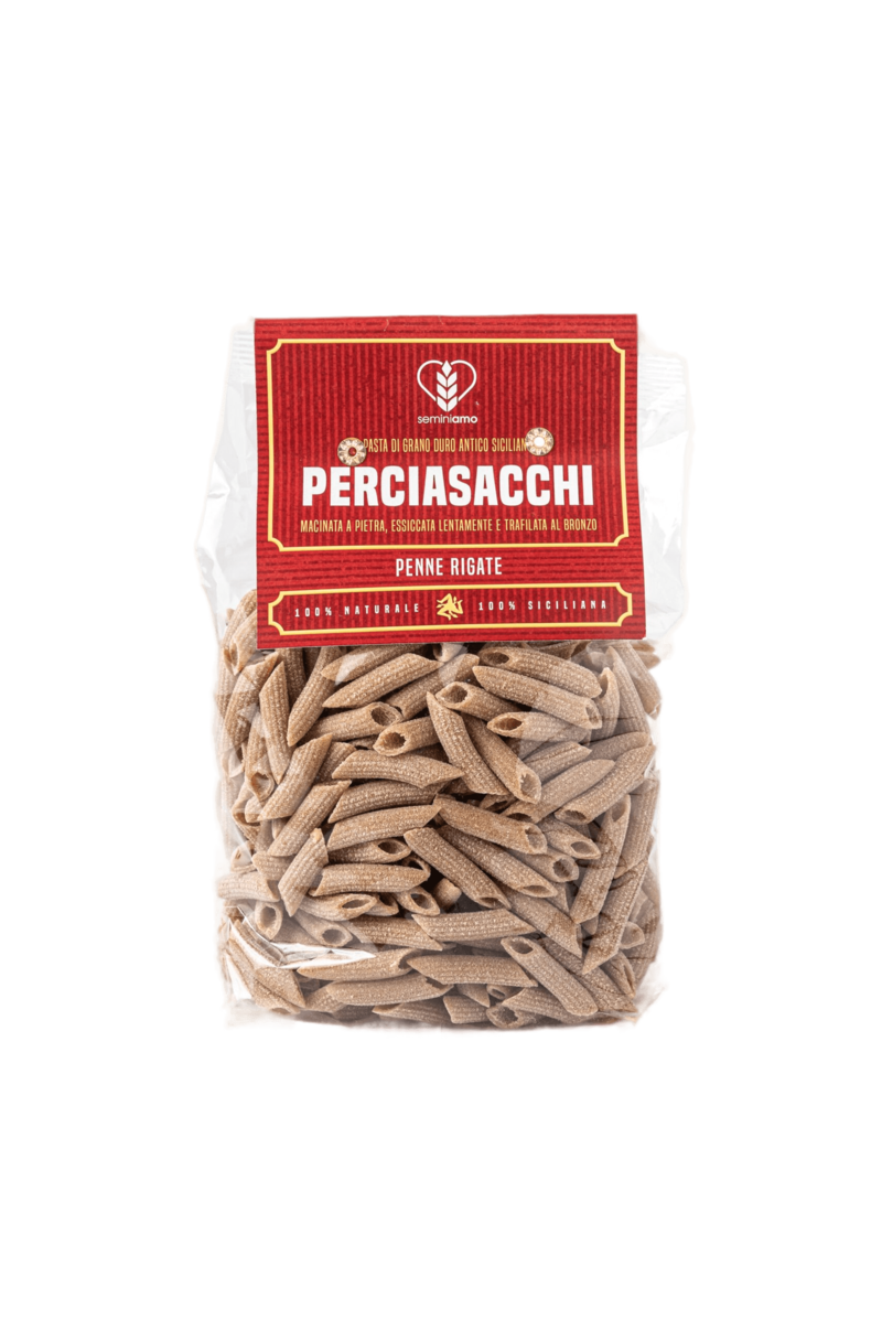 Pasta di grano duro antico 100% siciliano Perciasacchi macinata a pietra naturale, trafilata al bronzo ed essiccata lentamente a basse temperature.